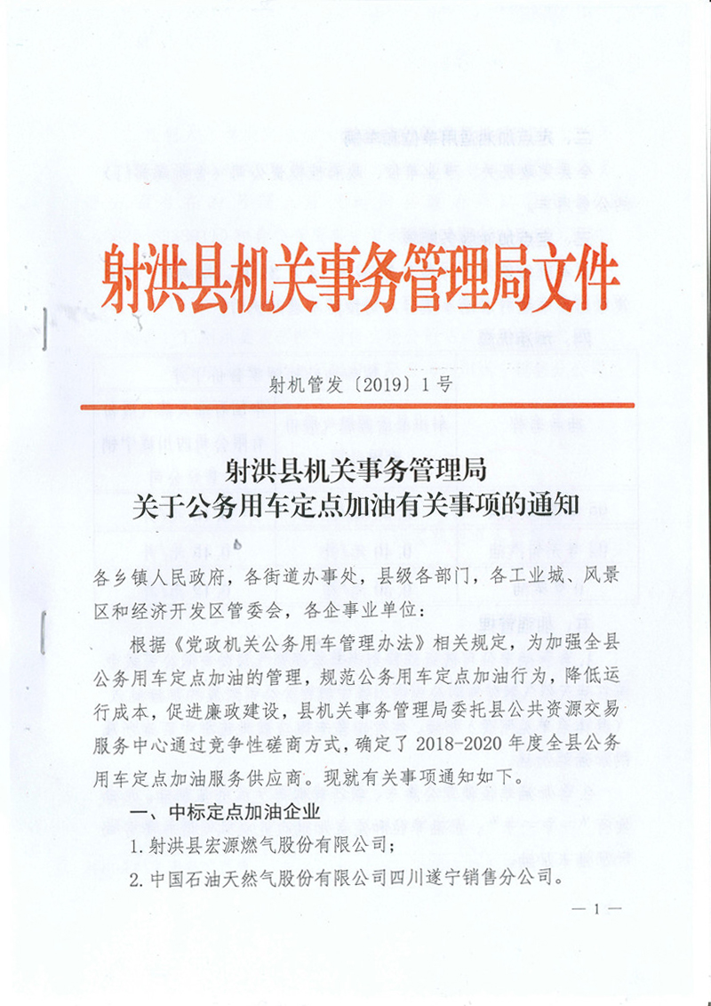 2019年1月2日,開年上班第一天,宏源公司收到射洪縣公共資源交易服務中心的“射洪縣2018—2020年度公務用車定點加油政府采購項目”的中標通知書。在此次全縣公務用車定點加油采購項目競爭性磋商中,宏源公司以406分第一名的最高評審得分成功中標。