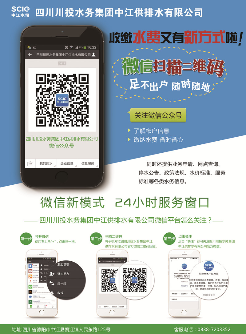 用戶通過關注“四川川投水務集團中江供排水有限公司”微信公眾號,綁定卡號,即可繳納水費,查詢欠費信息、繳費明細、用量明細,還可獲取收費標準、營業網點,并及時了解停水信息及相關政策法規。通過這一平臺,能夠實現用戶與川投水務中江水司之間的信息互動,讓廣大用戶足不出戶,動動手指就能完成水費繳費操作,不受時間、地域限制,切實減少用戶辦事來回跑的現象,為用戶日常生活提供極大便利。下一步,川投水務中江公司還將不斷完善收費系統和繳費方式,增加微信“生活繳費”接口和支付寶支付等便民服務項目。