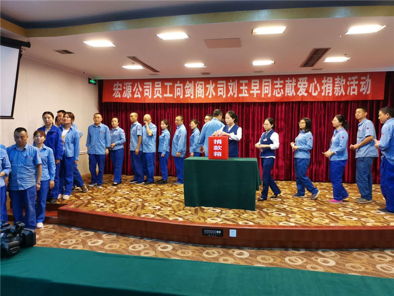 疾病無情,宏源有愛。2019年5月18日上午11:00,公司在11樓大會議室舉行了“向川投水務劍閣公司劉玉早同志捐款”活動,公司領導帶頭捐款,不當班的員工也早早到場,紛紛伸出援助之手,慷慨解囊。而當天因在值班生產不能到現場捐款的員工已經于17日晚上通過微信進行捐款,公司204名員工共籌集善款53161.00元。按照公司黨委書記、總經理李旭東的要求,當天下午14:00,公司工會主席倪沛林、綜合部經理劉平等一行驅車300多公里將所捐善款親手送到川投水務劍閣公司黨支部書記、總經理何天政的手中,轉達了宏源公司全體員工對劉玉早同志的關心和祝福。
