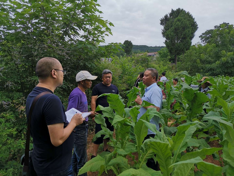 在田間地頭,杜總查看煙葉的長勢,詢問農戶水果的收成,農戶庭院經濟的規劃和發展。在青山村種煙大戶李孝林的煙地里,杜總與李孝林進行深入的交流,并對其聘請貧困戶幫忙干農活掙工錢的做法十分認可。