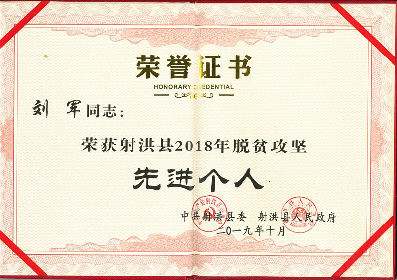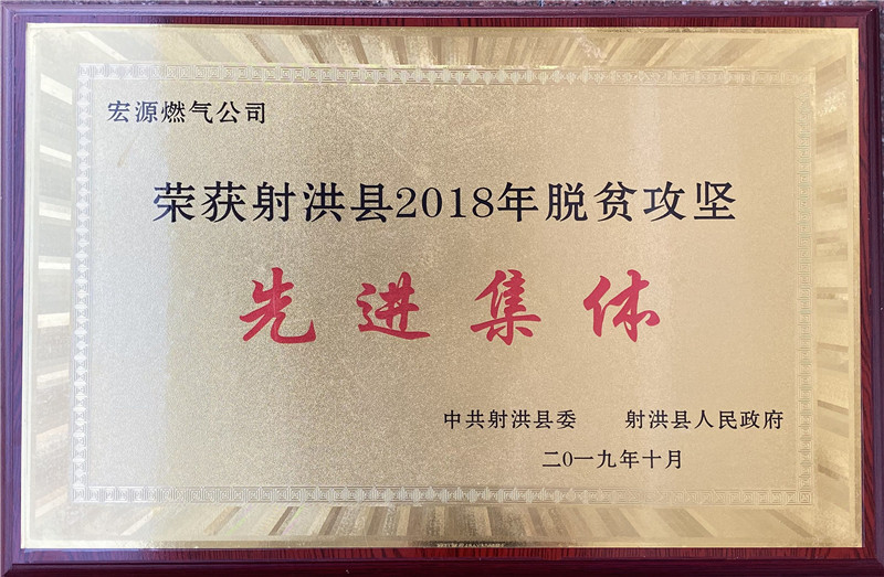 2019年10月15日,在射洪縣文化藝術(shù)中心召開的“大愛扶貧 濟(jì)善射洪—2019年射洪縣脫貧攻堅(jiān)暨社會(huì)扶貧工作推進(jìn)會(huì)”上,宏源公司被中共射洪縣委、射洪縣人民政府表彰為“射洪縣2018年度脫貧攻堅(jiān)先進(jìn)集體”,公司團(tuán)委書記、大榆鎮(zhèn)飛石溝村駐村工作隊(duì)隊(duì)員劉軍被表彰為“射洪縣2018年度脫貧攻堅(jiān)先進(jìn)個(gè)人”。