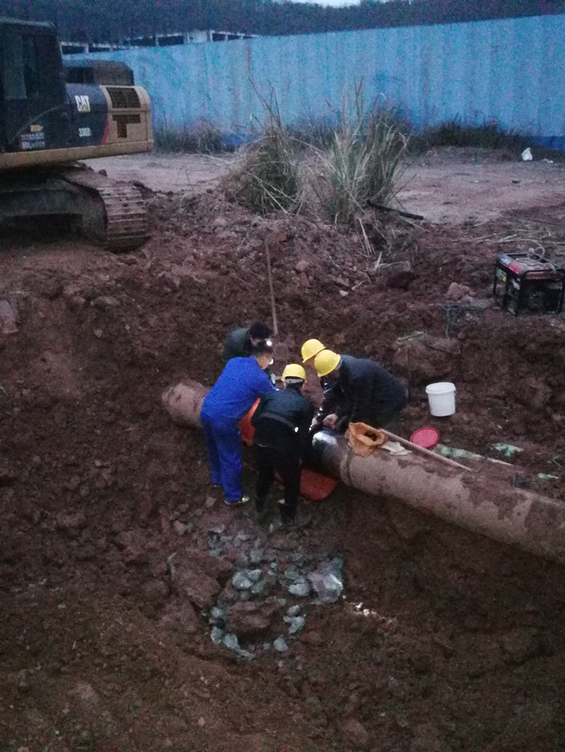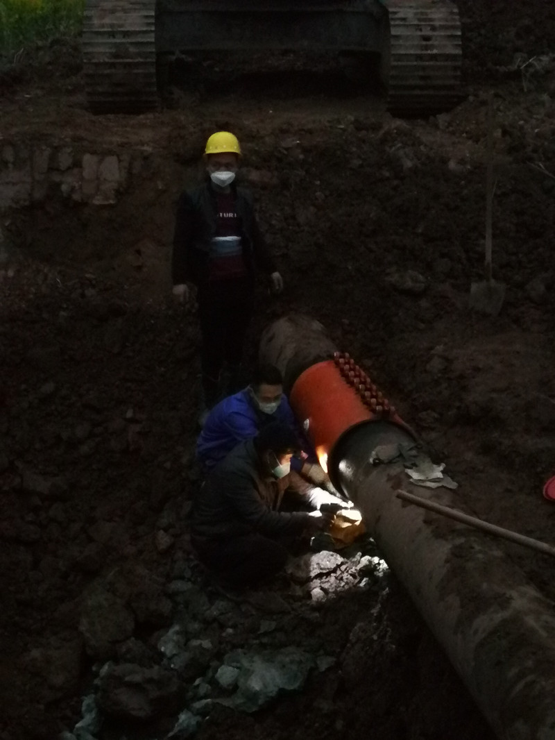 2月27日下午17時許,公司值班電話接到郪江新城施工方報告,因施工緊急,未事先向我司詢問供水管網走向而造成管道挖漏。公司接到報漏后,立即上報值班領導,經搶修人員第一時間趕到現場了解、查看,DN400球墨鑄鐵主管挖漏3個漏點,將會影響郪江新城片區涉及青龍灣小區、余糧村安置房和附近幼兒園、樓盤等共計3000余戶居民在疫情期間“宅”家正常用水和社區消毒工作。