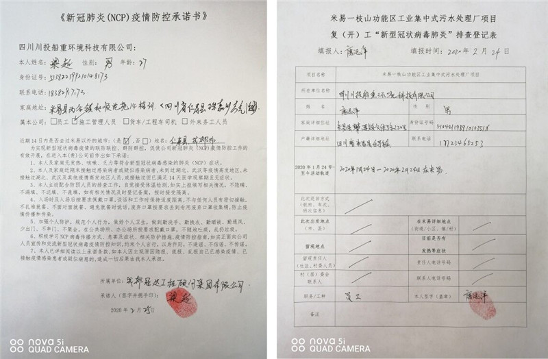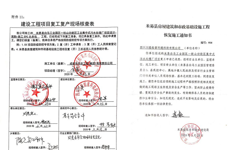 四川川投船重環境科技有限公司為堅決打贏新冠肺炎NCP疫情防控阻擊戰,早日實現項目復工,按照屬地管理要求,毫不松懈地抓好春節期間及節后公司、施工單位人員疫情防控工作,提前謀劃和部署公司及項目現場在NCP疫情期間的防控管理工作及施工組織方案、措施和應急預案。做好防疫情,抓復工,盯安全,重施工,合理有序組織復工及防疫工作。經米易縣政府組織有關部門對施工現場防疫措施及防疫物資準備等工作的現場核查,達到復工標準。在2020年2月28日取得米易縣首批建筑施工項目復(開)工批準令后復工(米易住建局編號014號《恢復施工通知書》),目前正按縣政府關于復工相關要求,全力組織施工單位人員持健康證明等手續陸續進場。