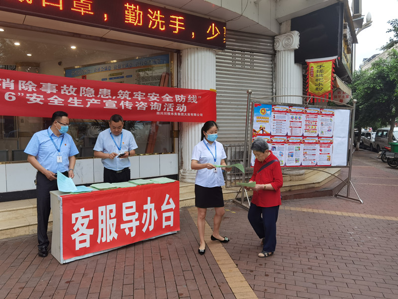 2020年6月是第19個全國“安全生產月”,根據川投水務集團關于印發《2020年“安全生產月”活動》的通知精神,大英水司結合2020年安全生產月“消除事故隱患,筑牢安全防線”活動主題,在公司樓下設置咨詢臺,開展了宣傳咨詢活動。公司副總經理、安全分管領導王洪先,安監部、客服部、綜合部相關人員參加了此次宣傳活動。