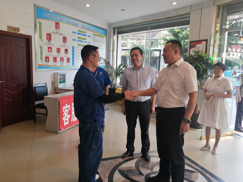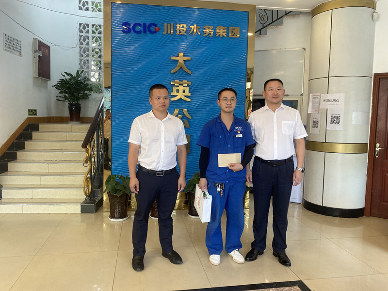 8月10日下午5時30分,大英縣委副書記、縣長胡銘超,縣委常委、縣委辦公室主任、縣總工會主席譚銀,遂寧市中國死海旅游度假區管委會副主任敬云川等領導來到川投水務大英水司老城服務大廳,向前幾日為最大限度保障供水、降低停水影響、毅然5次潛下灌滿消防水的閘閥井關閉閘閥而引發社會廣泛關注的川投水務大英水司“開關俠”魏巍表達問候和祝福,并送上慰問金。