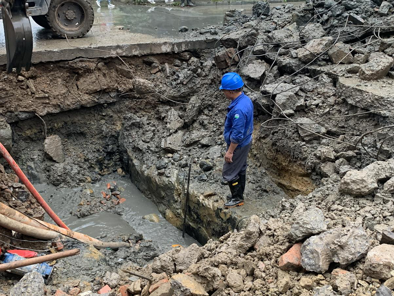 由于積水沿管線和四周持續(xù)外冒,漏點(diǎn)定位難度極大,應(yīng)急搶修人員首先劃定警戒區(qū)域,調(diào)度挖掘機(jī)破碎路面。同時(shí)領(lǐng)導(dǎo)班子研判:若要徹底排查并修復(fù)管道,必須關(guān)閉出水總閘,暫停縣城區(qū)供水,但考量到停水將影響近20萬居民用水,公司搶修人員先帶水作業(yè),查看漏點(diǎn)情況。公司按流程將情況上報(bào)縣委縣政府、各主管部門及水務(wù)集團(tuán),同步啟動(dòng)信息發(fā)布與輿情管理工作。
