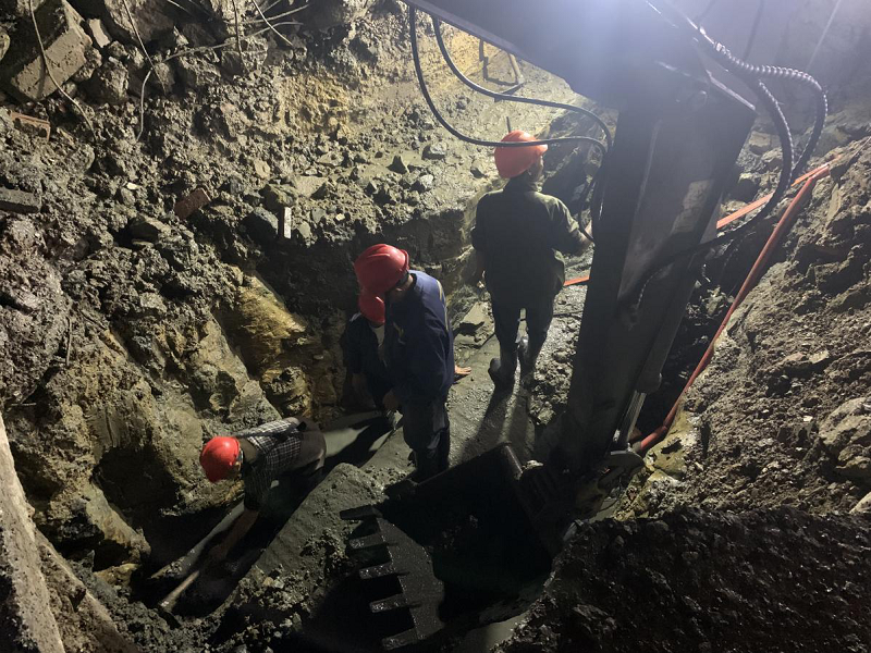 現(xiàn)場(chǎng)立即安排人員前往庫房調(diào)取專用搶修物資——8月定制的DN800球墨鑄鐵搶修節(jié)。又因取水主管底部及周邊被完整巖石包裹,機(jī)械開挖無法繼續(xù),作業(yè)方式緊急轉(zhuǎn)為人工開挖,6名作業(yè)人員在狹窄空間內(nèi)佝僂身體,持續(xù)挖掘直至晚上10時(shí)30分,終于開辟出合格作業(yè)面。隨后,施工人員用機(jī)械將搶修節(jié)運(yùn)送至作業(yè)點(diǎn),反復(fù)調(diào)整角度確保與管道精準(zhǔn)匹配,最終在10月22日凌晨2時(shí)21分完成全部搶修作業(yè)。