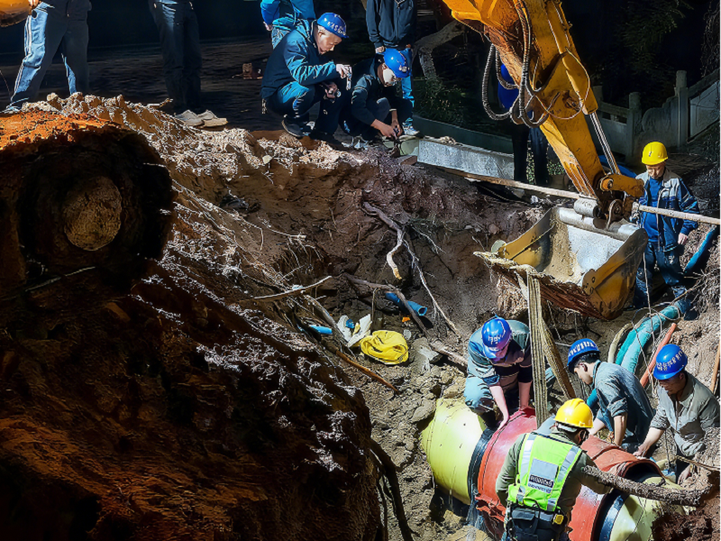 指令下達(dá)后,工程技術(shù)部經(jīng)理鄧先勇立即啟動(dòng)搶險(xiǎn)隊(duì)伍集結(jié)機(jī)制,在保障中金快通搶修力量的同時(shí),迅速組建第二支搶險(xiǎn)隊(duì)伍,投入到繼光水廠母管搶修任務(wù)。新任職的客戶服務(wù)中心業(yè)務(wù)主辦肖宇負(fù)責(zé)現(xiàn)場搶修協(xié)調(diào)和器材調(diào)配,緊急聯(lián)系施工單位,調(diào)集挖掘機(jī)、工程車、DN700玻纖管專用哈夫節(jié)等關(guān)鍵物資設(shè)備,并架設(shè)應(yīng)急照明,保障夜間作業(yè)條件。由于繼光水廠停產(chǎn)后母管內(nèi)殘留積水及其他支管積水回留,破裂處涌水量持續(xù)不斷,搶修坑內(nèi)積水嚴(yán)重,為盡快推進(jìn)修復(fù),現(xiàn)場立即協(xié)調(diào)3臺(tái)大流量潛水泵,實(shí)施連續(xù)抽排作業(yè),有效控制坑內(nèi)水位,為后續(xù)管道修復(fù)創(chuàng)造了關(guān)鍵作業(yè)條件。